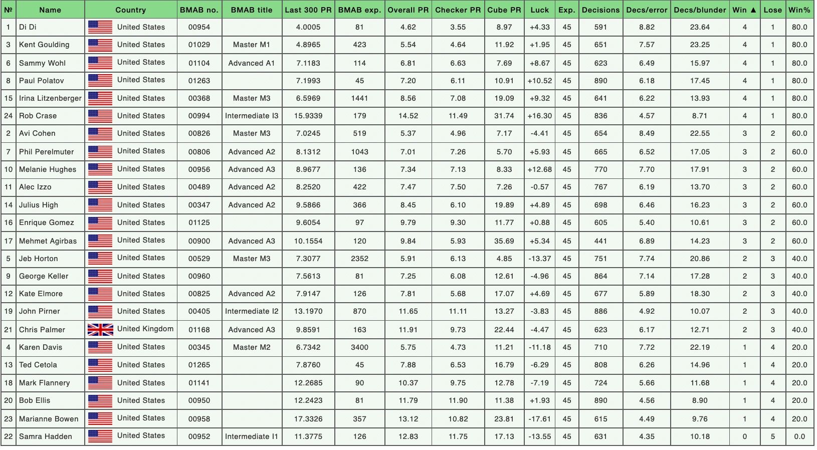 Art Benjamin played an impressive 2.70 and won the $50 PR side pool. While Art is always a solid player, he seems to even surprise himself with a Grand Master Zero level of play (below 2.75). Marty Storer was close behind at 2.74. Iron Star winner John O’Hagan played 3.87, while Finalist and GM2 Neil Kazaross played 4.34. Irina Litzenberger played her best BMAB yet with 4.95 to round out the “low five”. Canadians made up a quarter of the 20-player field. A shoutout to first-time tourney attendees Talbot Edwards and Sean O’Donnell. Tom Rebelo, making his first appearance at a BMAB event, played to an impressive 5.72. The unlucky dice award went to Marty Storer. Marty had a lack of -18.54, handily edging out Anatoliy Katsnelson (-13.24) and Art Benjamin (-13.21). Congratulations as well to the participants below that increased their BMAB titles. Thanks to all the participants that help make this another great event!